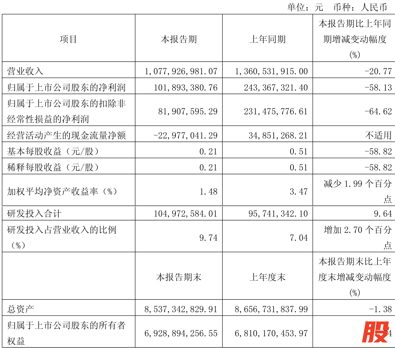 中证智能财讯华熙生物(688363)4月26日披露2025年第一季度报告。公司实现营业总收入10.78亿元,同比下降20.77%;归母净利润1.02亿元,同比下降58.13%;扣非净利润8190.76万元,同比下降64.62%;经营活动产生的现金流量净额为-2297.7万元,上年同期为3485.13万元;报告期内,华熙生物基本每股收益为0.21元,加权平均净资产收益率为1.48%。