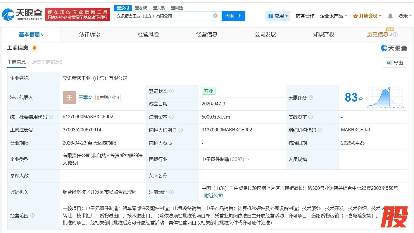 每经AI快讯,天眼查App显示,近日,立讯精密工业(山东)有限公司成立,法定代表人为王军奕,注册资本5000万元人民币,经营范围包括电子元器件制造、汽车零部件及配件制造、电气设备销售等,由立讯精密(002475)旗下立讯精密工业(昆山)有限公司全资持股。